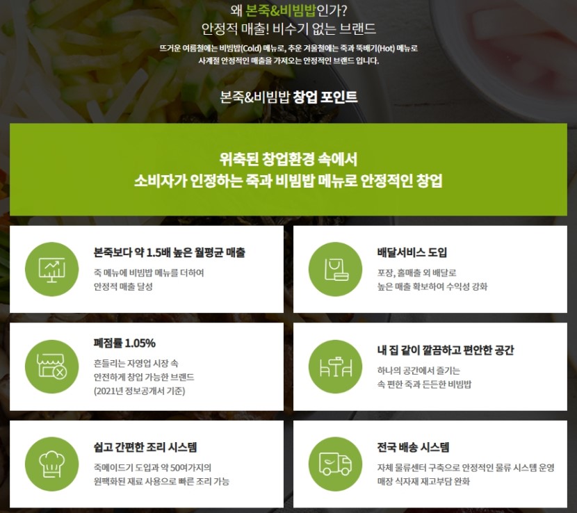 800여개의 점포를 가진 메이저 죽브랜드에서 발전해 매출력 상승을 위한 변화로 탄생한 본죽은 본죽앤비빔밥 매장까지 합치면 1330여개 점포가 있어 강동구에는 신규 입점지가 거의 없는 상황이기 때문에 자리 잡힌 사업체를 합리적인 권리금으로 양도양수 하시는 것을 추천드립니다