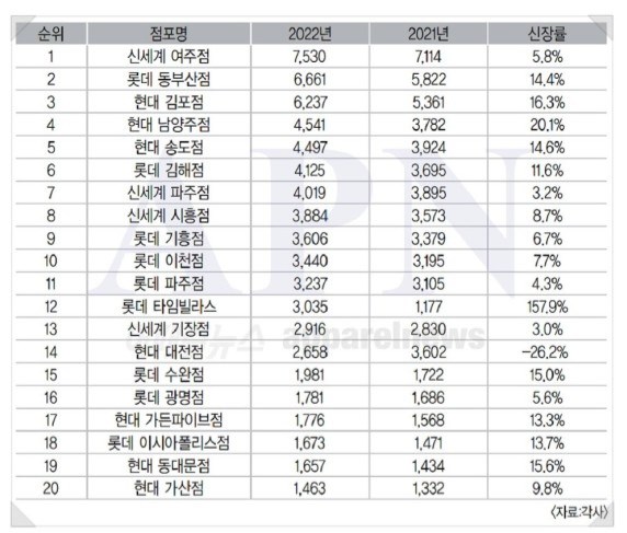 2022년도 빅3 아울렛 매출순위 탑20